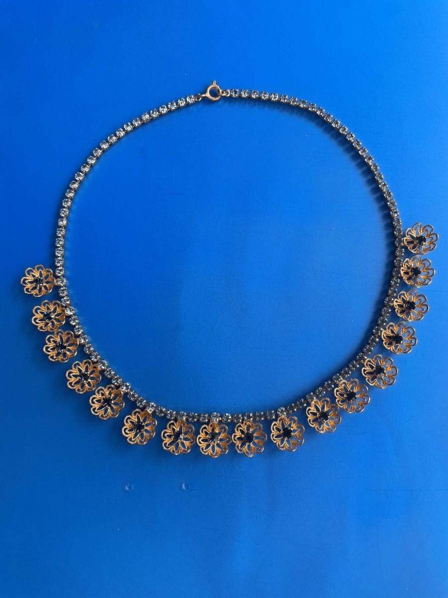 stunning 1960s gold plated flower necklace with blue rhinestone details