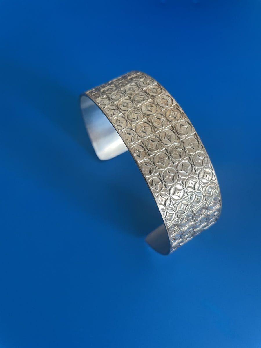 Print pattern narrow silver plated cuff inspired by 1970s fabric prints. one of a kind experimental piece