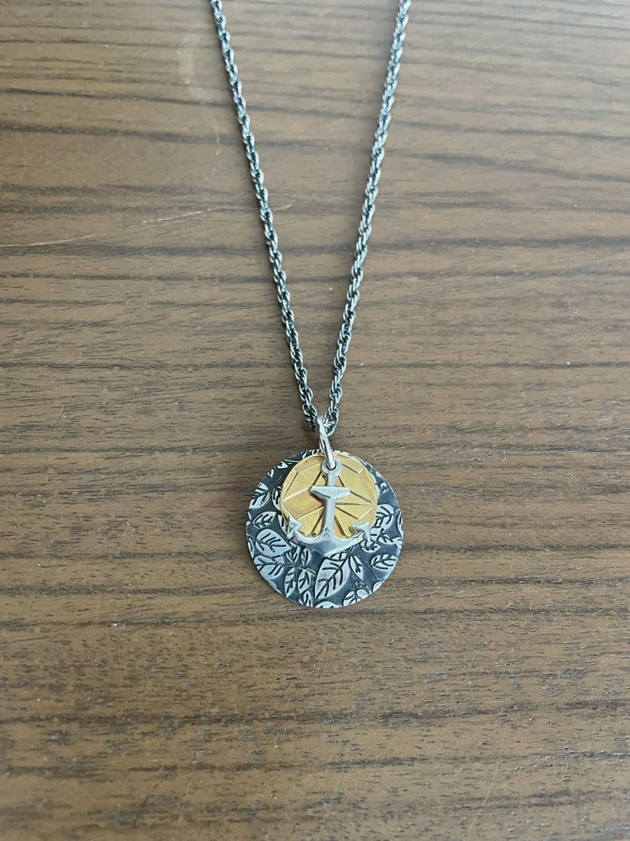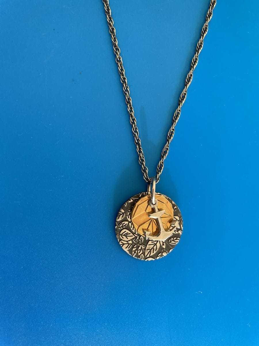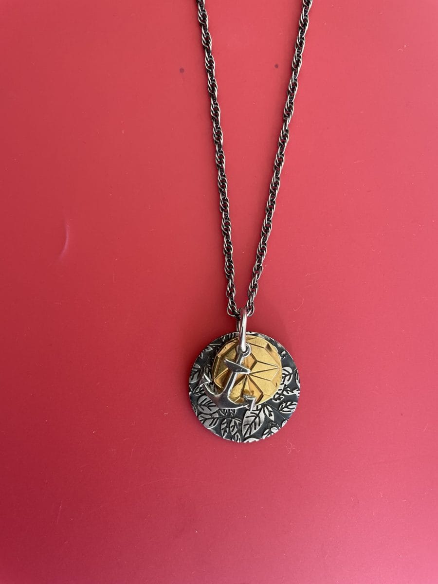 One of a kind unisex necklace with fabric print patterns gold and black plated and vintage sterling silver Anchor (2.5cm diameter)