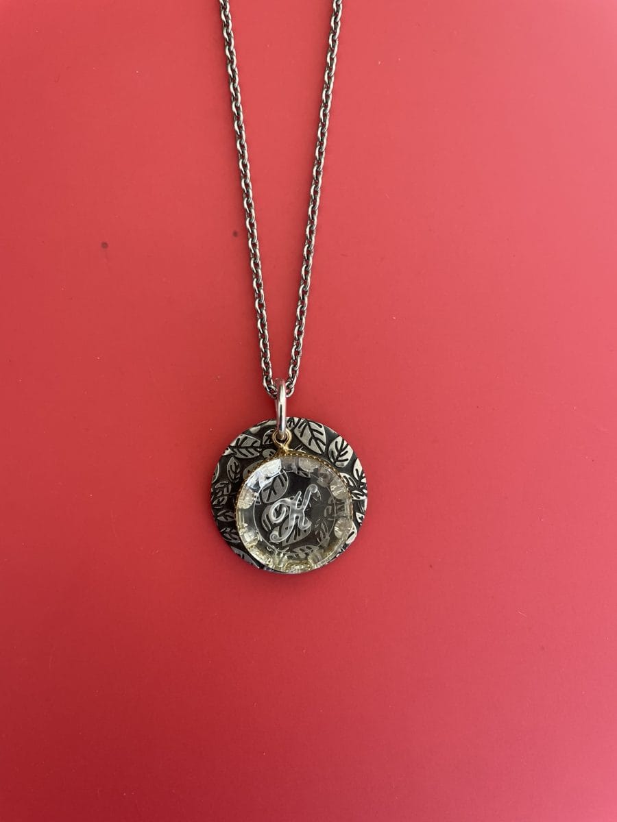 One of a kind unisex necklace with fabric print patterns and glass initial K Gold plated vintage charm (2.5cm diameter)