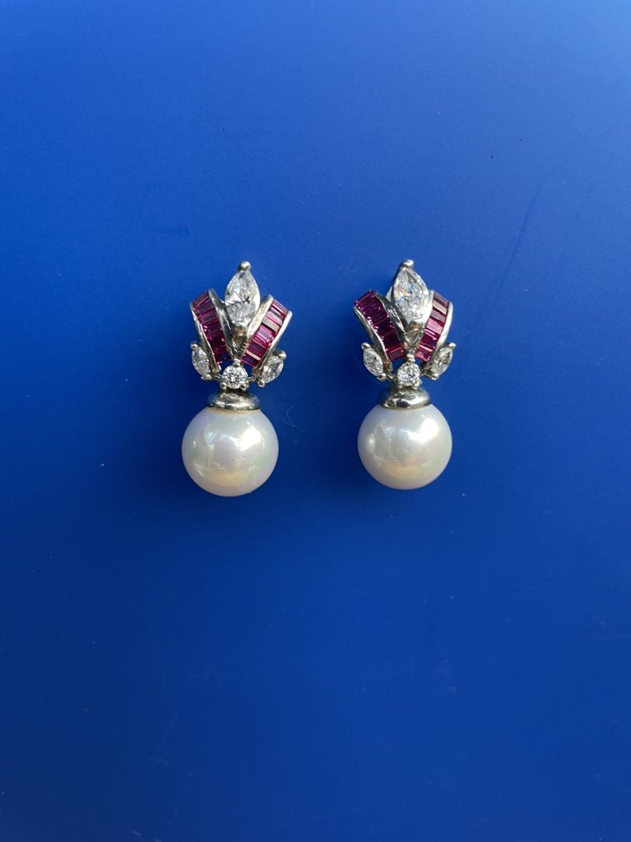 Stunning sterling silver vintage earrings set with red and clear crystal and a drop pearl
